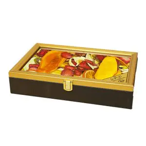 وزن خالص ۱.۳ کیلوگرم، شامل پسته اکبری VIP عرشیا، پسته اکبری فوق ممتاز عرشیا، پسته شور و ترش، پسته سماقی، پسته پیاز جعفری، پسته آریایی، جعبه چوبی