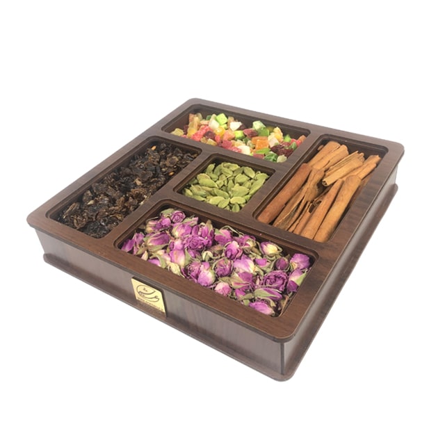 وزن خالص ۸۰۰ گرم، شامل چوب دارچین، حبه میوه استوایی، پر لیمو عمانی، غنچه گل سرخ و هل