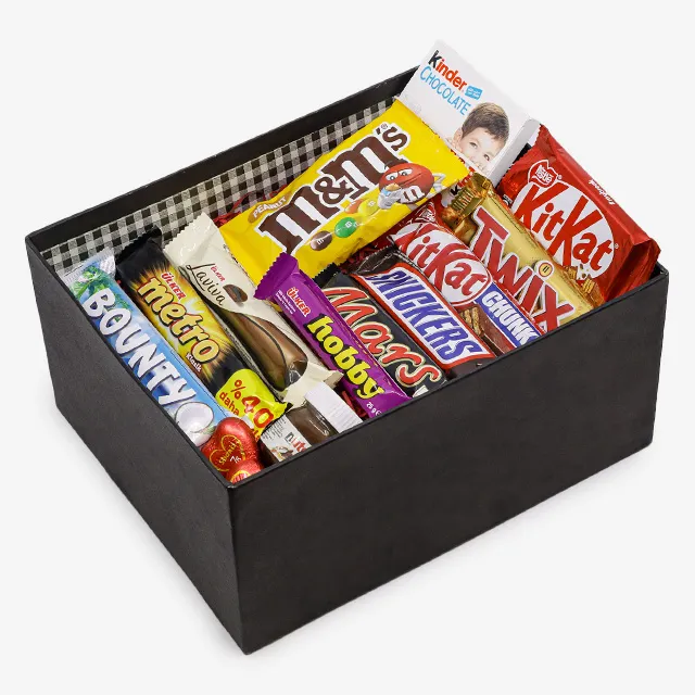 اقلام جعبه:1 عدد اسنیکرز،1 عدد مارس ، 1 عدد هوبی 1 عدد کیت کت 4 انگشتی ، 1 عدد کیندر 4 انگشتی 1 عدد کیت کت چانکی، 1 عدد مترو ، 1 عدد لاویوا ،1 عدد مینی نوتلا 1 عدد توییکس،1 عدد بونتی، 1 عدد ام اند ام به همراه گل و اشانتیون