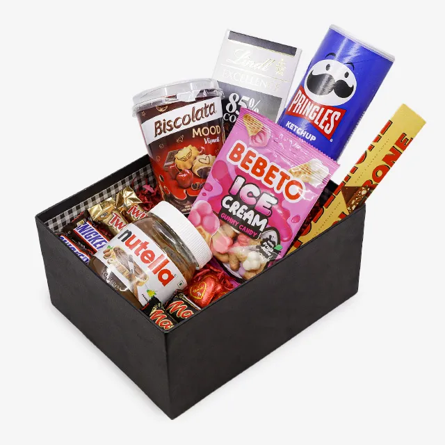 اقلام جعبه:2 عدد مینی اسنیکرز،2 عدد مینی مارس،1 عدد ببتو بستنی،1 عدد تابلرون،3 عدد شکلات قلبی،1 عدد نوتلا 350 گرمی ،2 عدد مینی توییکس ،1 عدد پرینگلز 1 عدد لینت ، 1عدد بیسکولاتا به همراه گل و اشانتیون