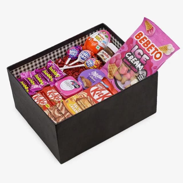 اقلام جعبه:1 عدد میلکا سکه ای، 5 عدد مینی هوبی، 1 عدد پاستیل ببتو، 1عدد کیندر جوی،2 عدد کیت کت مینی 1 عدد کیت کت تخته ای،1 عدد مینی نوتلا،3 عدد آبنبات چوبی 1 عدد خوشبو کننده کامپس به همراه گل و اشانتیون