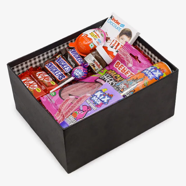 اقلام جعبه:2 عدد مینی اسنیکرز،1 عدد پاستیل نواری ببتو،1 عدد کیندر جوی،1 عدد کیندر 4 انگشتی،2 عدد کیت کت مینی،1 عدد مینی نوتلا،1 عدد نوشیدنی کیک مکس،1 عدد ژله کیک مکس 1 عدد آبنبات چوبی به همراه گل و اشانتیون