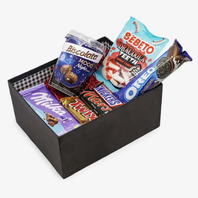 اقلام جعبه:1 عدد اسنیکرز،1 عدد مارس،1 عدد میلکا بابلی 1 عدد پاستیل ببتو ، 1 عدد اورئو،1 عدد توییکس،1 عدد بیسکولاتا به همراه گل و اشانتیون