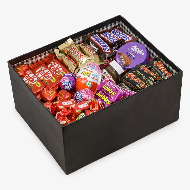 اقلام جعبه: 4 عدد مینی اسنیکرز،4 عدد مینی مارس 1 عدد میلکا سکه ای، 4 عدد مینی هوبی،1 عدد کیندر جوی 4 عدد کیت کت مینی،4 عدد توییکس مینی، 1 عدد مینی نوتلا 8 عدد شکلات روشن،2 عدد آبنبات چوبی، به همراه گل و اشانتیون رنگ جعبه متغیر می باشد.