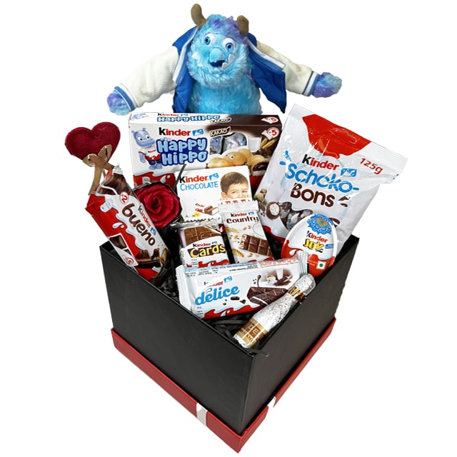 شامل: کیندر شوکو بونز، کیندر هپی هیپو، شکلات شیری کیندر ۵۰ گرم، کیندر جوی تخم مرغ شانسی، کیک کیندر، کیندر بونو شکلاتی، کیندر کانتری، کیندر کارتز، به همراه عروسک سالیوان و المان های کادویی، (رنگ باکس قرمز و مشکی)